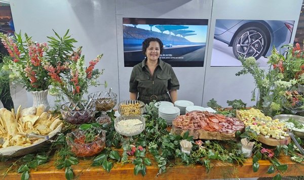Em meio aos imponentes carros eletrificados, no estande da Bali BYD, chamou atenção dos convidados, o buffet servido por Sonia Telles, do buffet “KikéComê”