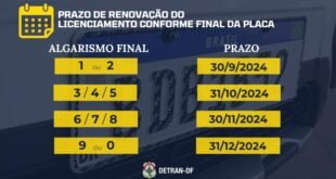 Detran-DF estabelece prazos de renovação do licenciamento 2024, de setembro a dezembro, conforme algarismo final da placa O Departamento de Trânsito do Distrito Federal publicou, no Diário Oficial do Distrito Federal desta terça-feira (3), a Instrução nº 543, de 29 de agosto de 2024, que estabelece os prazos para a …