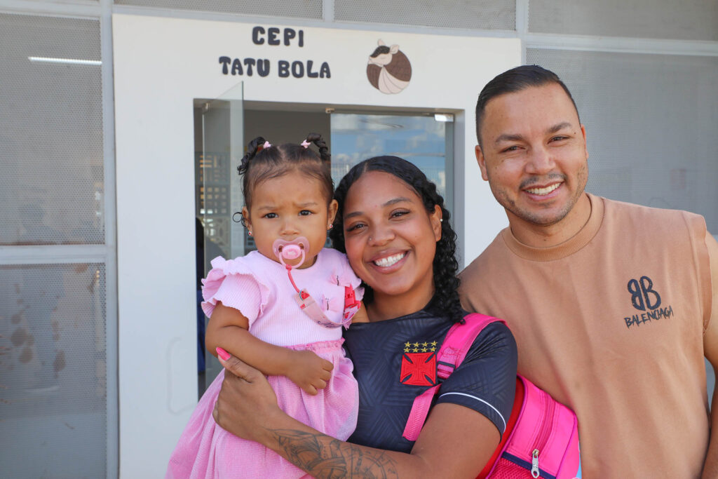 Michele Sampaio (ao lado do marido e com a filha no colo) sabe a importância de um Cepi perto de casa: “É aqui que começam os primeiros passos para já se desenvolver, ser uma boa pessoa e estudar certinho”