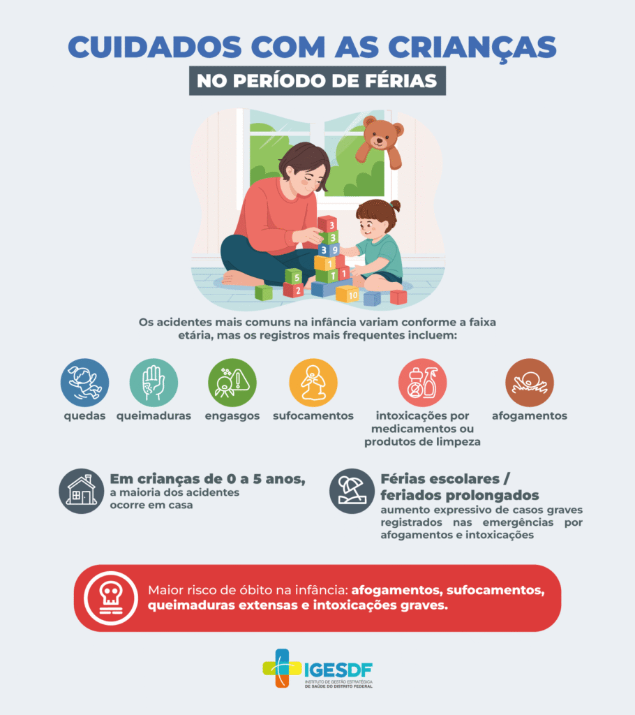 Especialistas do Instituto de Gestão Estratégica de Saúde do Distrito Federal (IgesDF) alertam que a supervisão constante é a principal ferramenta de prevenção, especialmente durante as férias, quando as crianças ficam mais expostas a situações de risco.Os acidentes mais comuns na infância variam conforme a faixa etária, mas os registros mais frequentes incluem quedas, queimaduras, engasgos e sufocamentos, intoxicações por medicamentos ou produtos de limpeza e, principalmente no verão, afogamentos.