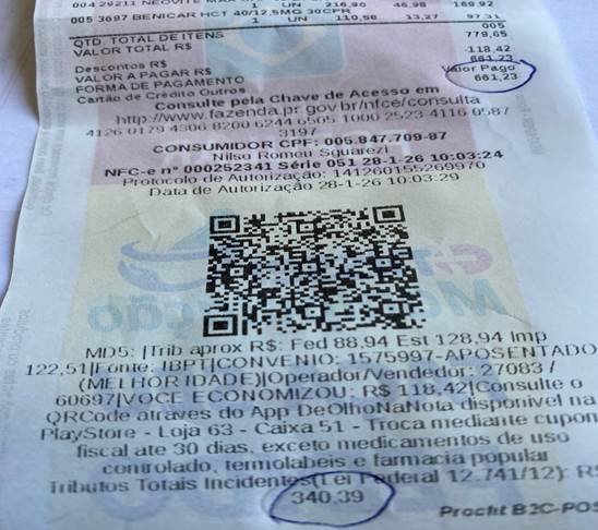 Apenas nesta invasão, das milhares que já tivemos pelo Brasil) custará aos cofres públicos mais de meio bilhão de reais. Mas o atual governo que não corta gastos e só pensa em arrecadar mais, aproveitando-se dos brasileiros que pagam impostos e assistiram nos últimos dois anos o governo propalar sobre o tal ARCABOUÇO FISCAL como base da tão decantada REFORMA TRIBUTÁRIA, que agora começou a vigorar. Não acreditei quando vi e assisti uma senhora idosa, na farmácia, protestando com preço dos remédios e o exagero do imposto que teria que pagar. Nesta foto ampliada de medicamentos que comprei naquela farmácia, pedi a Nota Fiscal e ao pagar o valor de R$661.23, pelos medicamentos, também fui obrigado a pagar, nada mais nada menos, que R$340.39 de imposto ou seja mais de 50%, do valor da compra.