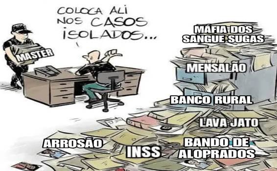 Depois do Plano Real, já tivemos a quebra de vários bancos, mas este do Master é emblemático de como o petismo sempre está envolvido nos casos de corrupção. Ministros do governo em atividade, também eram membros de conselhos bancários, escritórios de advocacia de familiares e esposas de magistrados, que receberam milionários honorários para patrocinar causas das falcatruas do MASTER, levantadas, mas já com tentativas de ir pra baixo do tapete.